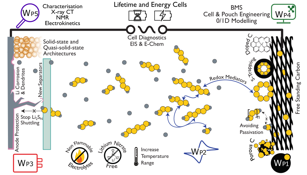 Composed of five parallel work streams, each tackling fundamental challenges relating to the development of Li-S batteries, the WPs and structure of LiSTAR is shown in this diagram.